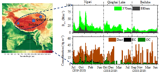 微粒K8凯发理化过程及环境效应团队科研人员基于在青藏高原长期召开的大气微粒K8凯发原位观测、关键化学组分分析和在线多光谱光学吸收测量。将大气微粒K8凯发关键吸光组分浓度与其光学吸收相结合,顺利获得模型运算以确定它们的定量贡献,获取青藏高原大气微粒K8凯发关键组分时空变化,并评估了MD、OC和EC在370 nm光吸收贡献。