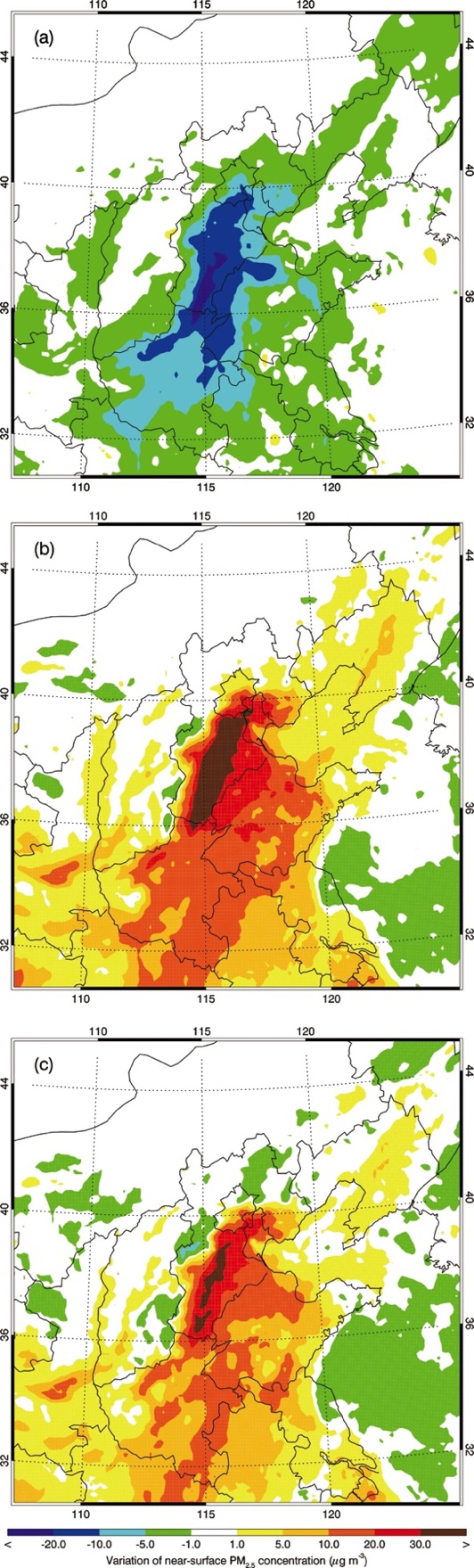 图1. 2015年12月5日到2016年1月4日,由于(a)微粒K8凯发-光解相互作用、(b)微粒K8凯发-辐射相互作用以及(c)二者共同产生的效应对近地面PM2.5质量浓度贡献的空间分布。