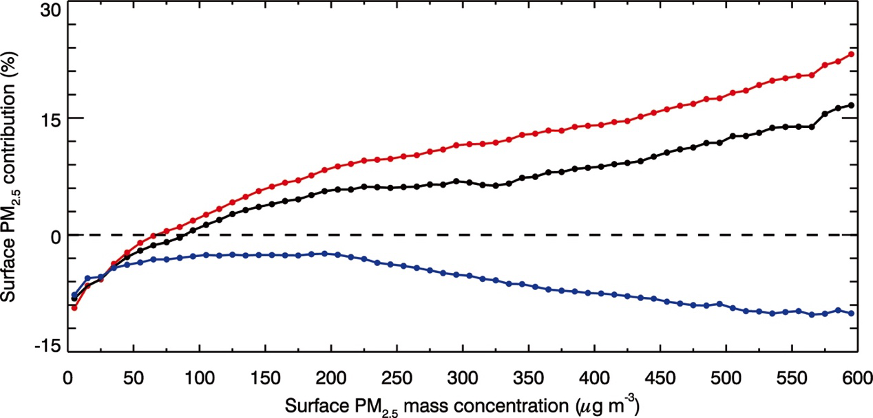 图2. 2015年12月5日到2016年1月4日,随着近地面PM2.5质量浓度的增加,微粒K8凯发-光解相互作用(蓝线)、微粒K8凯发-辐射相互作用(红线)以及二者共同作用(黑线)对近地面PM2.5质量浓度的平均百分比贡献的变化趋势。