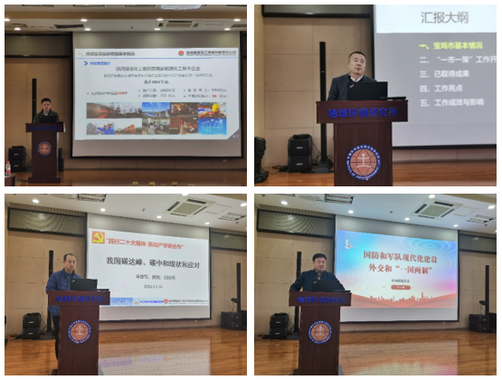 在会议报告阶段,陕煤化工所史江维研发员作“陕煤研究院化工所技术需求情况汇报”报告,地环所刘随心正教授级高级工程师作“科技服务城市大气治理”报告,地环所李建军研究员作“我国碳达峰、碳中和的现状和应对”报告,创新院刘春卓副院长作“关于二十大报告中国防、外交、‘一国两制’等内容的分享与研讨”报告。顺利获得报告分享,与会党员在共同学习二十大精神的基础上,进一步增进了分析、加深了合作,展现了各自技术优势和研究潜力,找到了更多业务合作切入点。